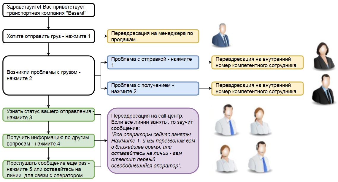 • Динамическая. В этом случае используется распределитель, и задаются алгоритмы соединения. При этом учитывается не только компетентность специалиста, но также региональность, часовые пояса. Так, если компания работает на всей территории страны, то звонки московских абонентов, интересующихся ассортиментом, будут переводиться на отдел продаж московского филиала. А звонки новосибирских клиентов, которые хотят подтвердить оплату товара, на бухгалтерию новосибирского филиала или близлежащего к этому городу.