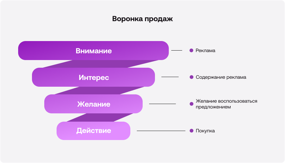 Она работает так: число пользователей сокращается по мере прохождения цепочки, так как не все готовы приобрести продукт сразу. Процесс разделяет аудиторию по степени готовности к покупке. Важно регулярно анализировать и оптимизировать воронку продаж, чтобы повышать уровень конверсии и лучше удерживать аудиторию.